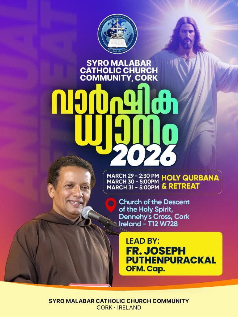 കോർക്ക്: കോർക്ക് സിറോ-മലബാർ കത്തോലിക്കാ കമ്മ്യൂണിറ്റിയുടെ ആഭിമുഖ്യത്തിൽ ഈ വർഷത്തെ നോമ്പുകാല വാർഷിക ധ്യാനം മാർച്ച് 29-ന് ഓശാന ഞായറാഴ്ച ആരംഭിക്കും. Dennhy’s Cross ദേവാലയത്തിൽ ഉച്ചകഴിഞ്ഞ് 2.30ന് ഓശാന തിരുക്കർമ്മങ്ങളോടെയാണ് ധ്യാനപരിപാടികൾക്ക് തുടക്കമാകുന്നത്. പ്രശസ്ത ധ്യാനഗുരുവായ റവ. ഫാ. ജോസഫ് പുത്തൻപുരക്കൽ OFM Cap ധ്യാനശുശ്രൂഷകൾക്ക് നേതൃത്വം നൽകും.